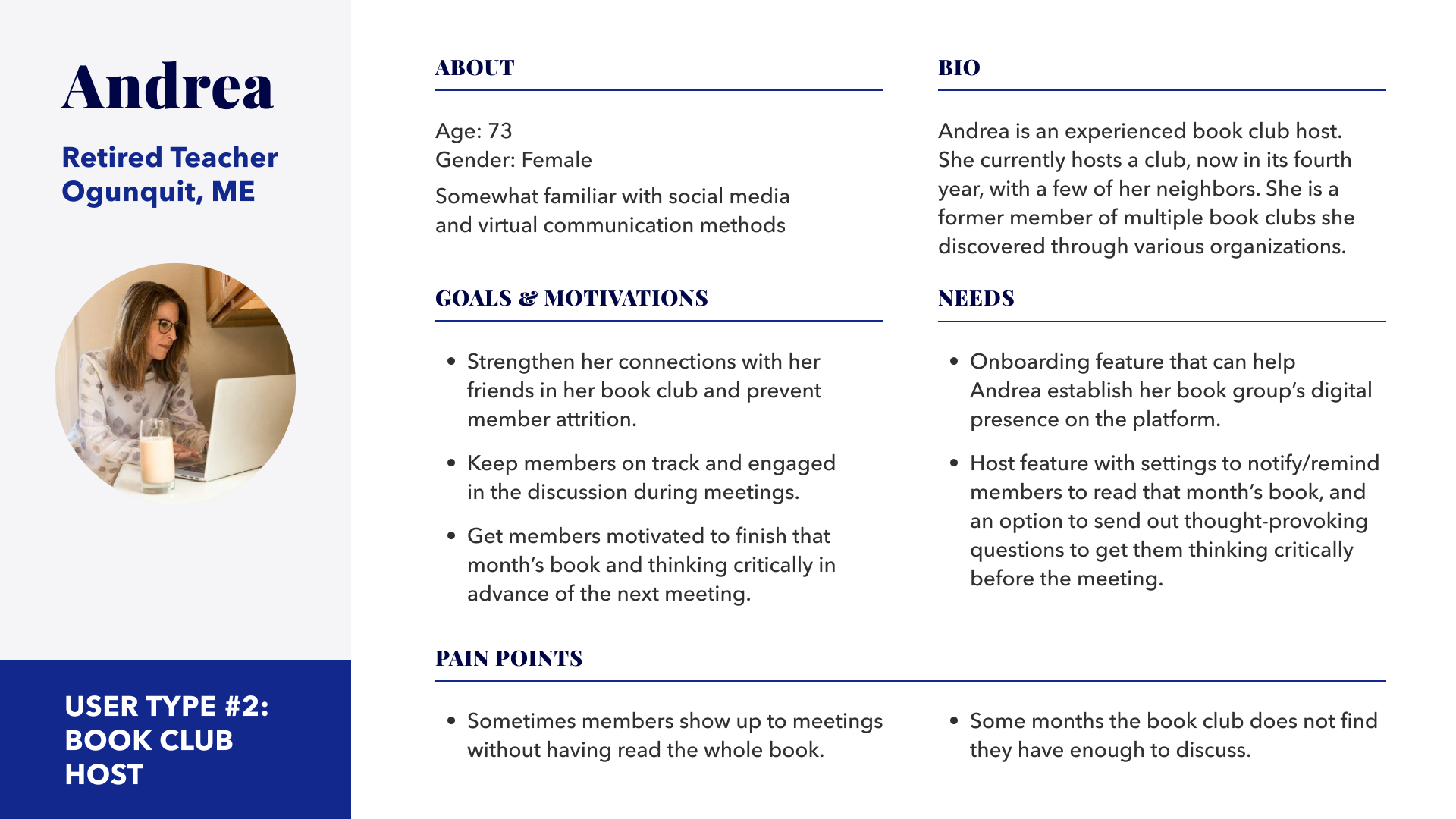 Having completed the interview analysis phase, it became possible to understand who the target audience was: primarily, though not necessarily, women of most demographic brackets, for whom social bonds were important. Although they did have limited free time, they generally made a point to attend their book clubs in person when possible.