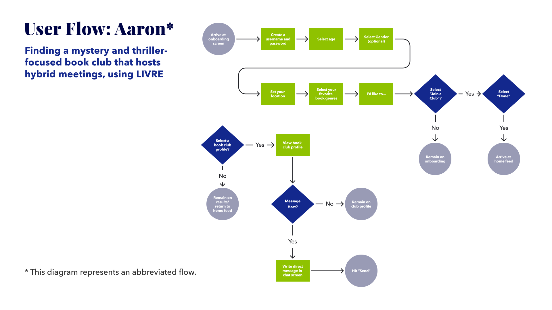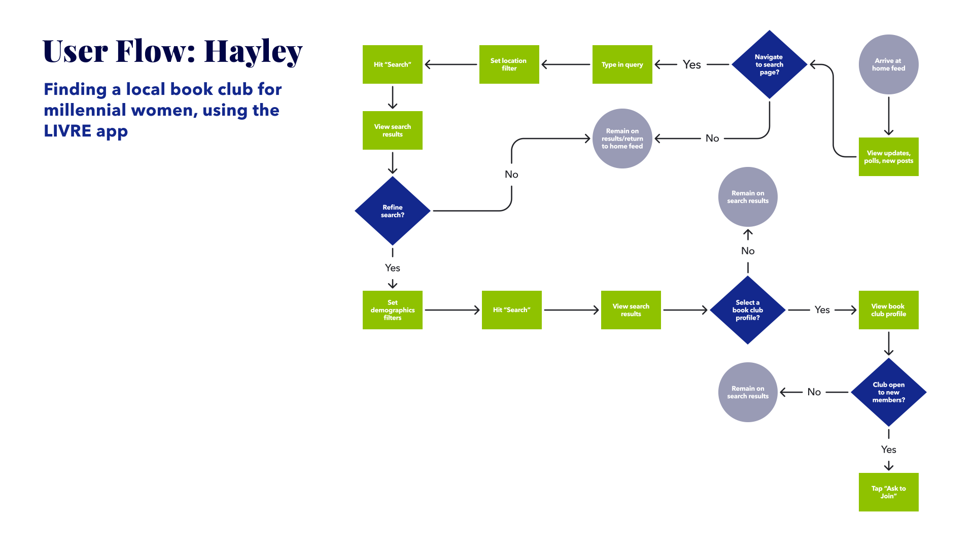 Having decided on the features necessary to help Hayley and Aaron accomplish their tasks, the overall design of LIVRE became the new focus. The first step in this process was a set of user flows, one for each persona. Hayley and Aaron’s user journeys served as the basis of each respective flow.