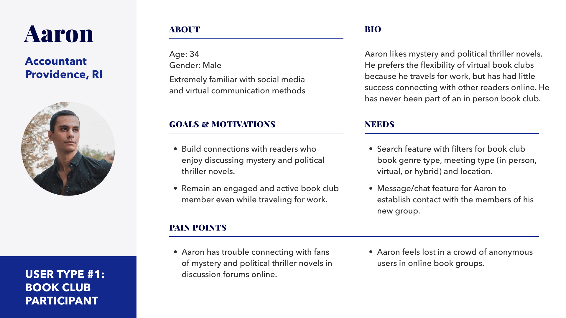The information gathered became the inspiration for a series of user personas. Two readers, Hayley and Aaron, are book club participants, and are both currently looking for book clubs to join. They are the basis for LIVRE’s primary user type, or User Type #1. A third reader, Andrea, is a book club host. She is the basis for LIVRE’s secondary user type, or User Type #2.