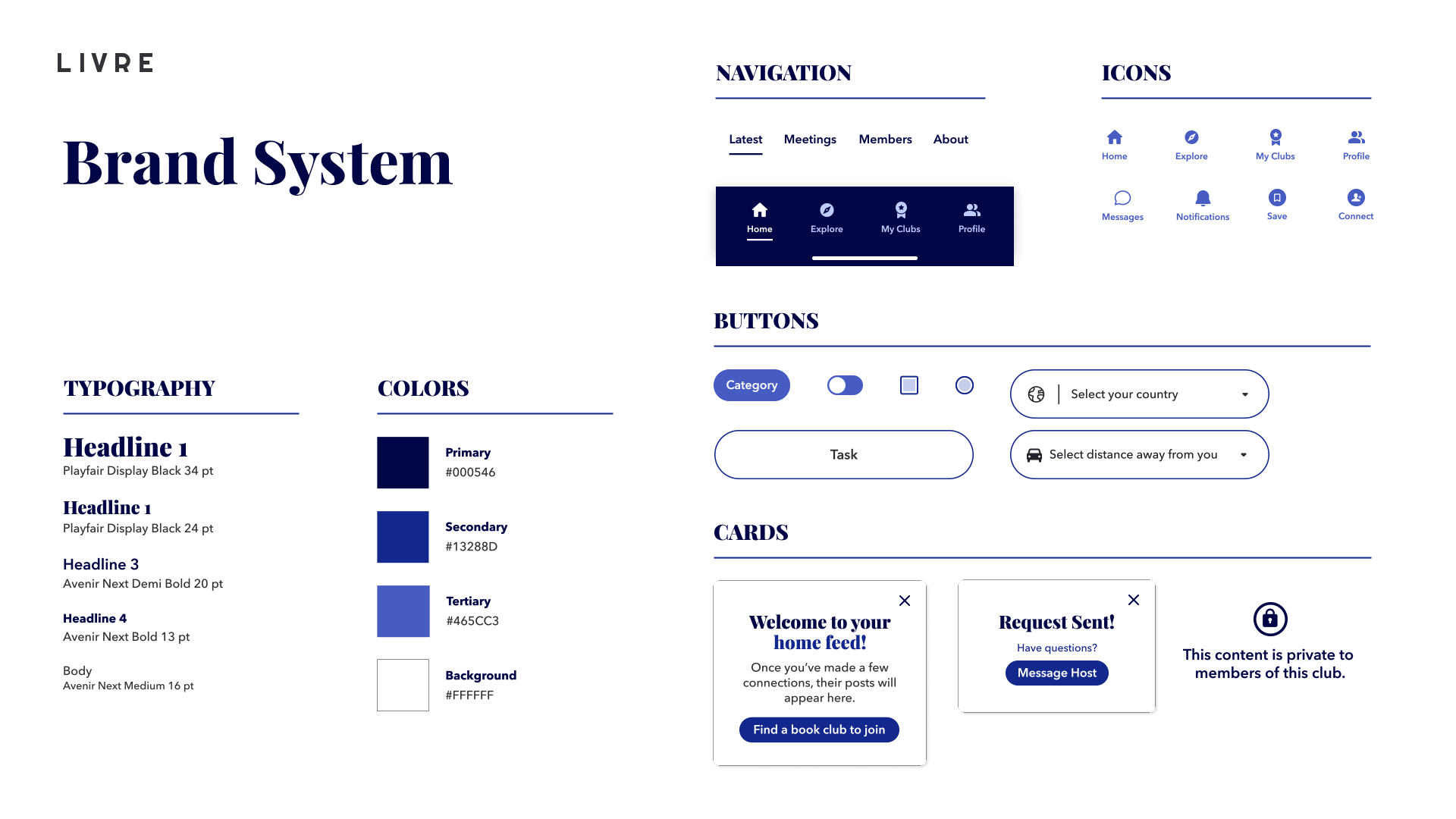In order for LIVRE to look and feel like a conventional product, designing a simple brand system occupied a small yet important role in the design phase of this project. Branding work included creating a logo, selecting fonts, icons, and colors, and building out a series of cards and other elements, such as buttons, filter tabs, and the bottom navigation.
